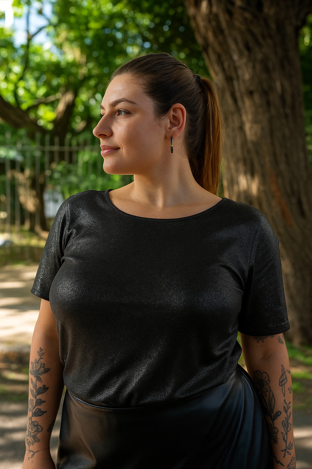 Remera manga corta cuello redondo con espalda en U. Hecha de Tul brilloso. Hermosa para complementar cualquier look!