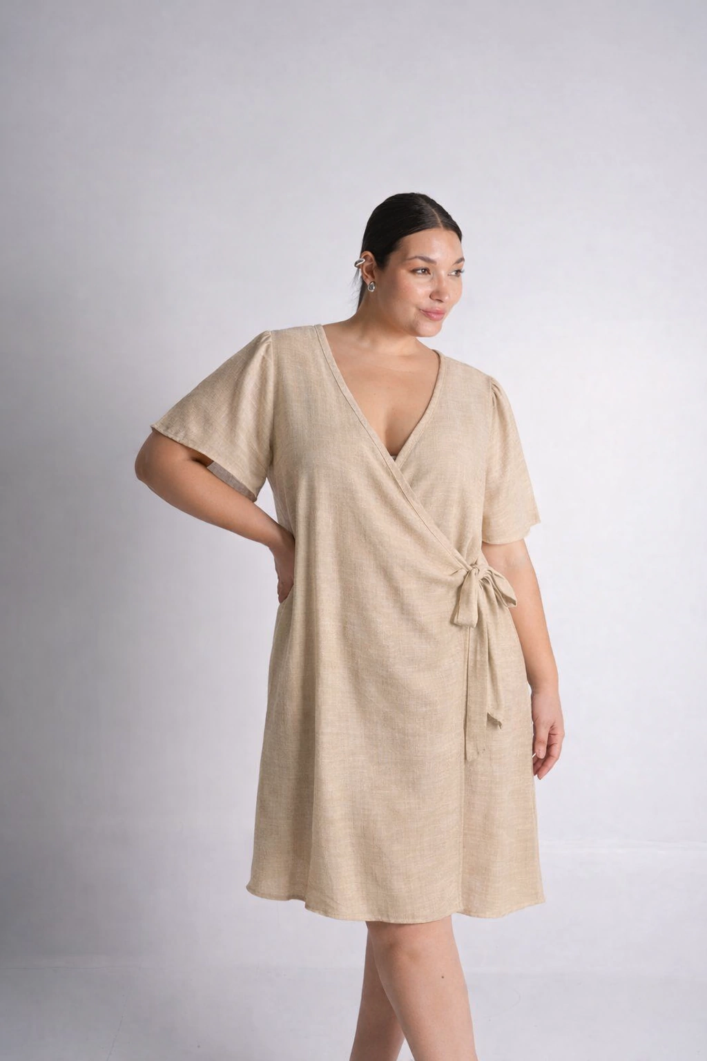 Vestido cruzado escote en V. Hecho de Lino Vintage texturado. Viene con lazo para atar en cintura.